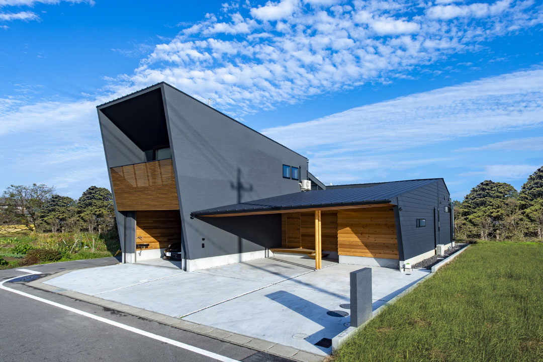 ガレージ、中庭のある平屋建て住宅。中央の大きな中庭を囲むロの字型の回廊が、光と風を豊かに招き家族の存在をいつも近くに感じられる心地よい距離感を保っています。